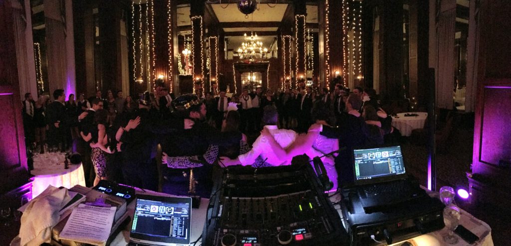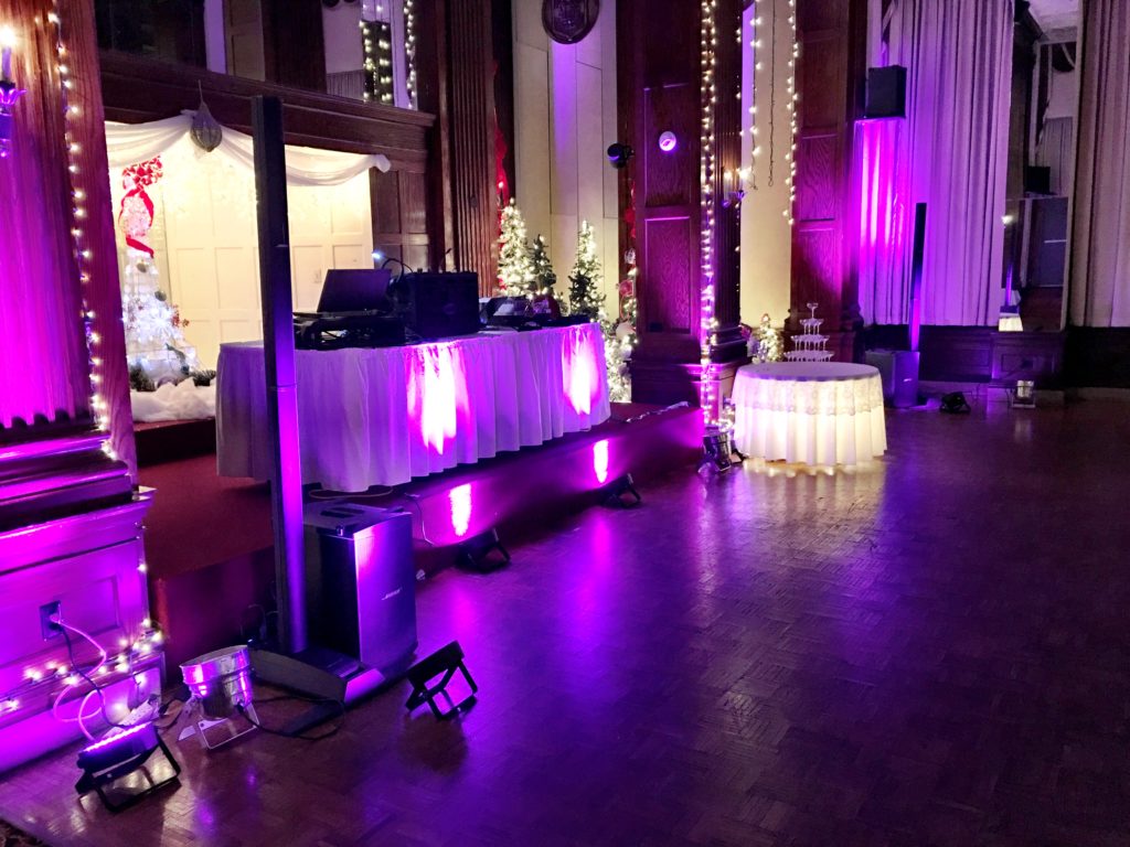 (Below) My two Bose L1 Model 2 Audio Towers and lighting package of eight (8) Chauvet EZpar 64 uplights setup and ready to go at a New Years Eve Wedding in the Ballroom of the Clarion Hotel Morgan in downtown Morgantown, WV December 31, 2016.